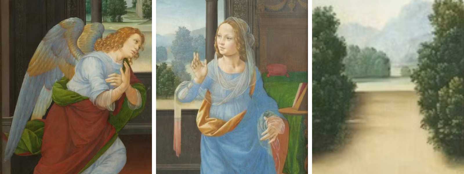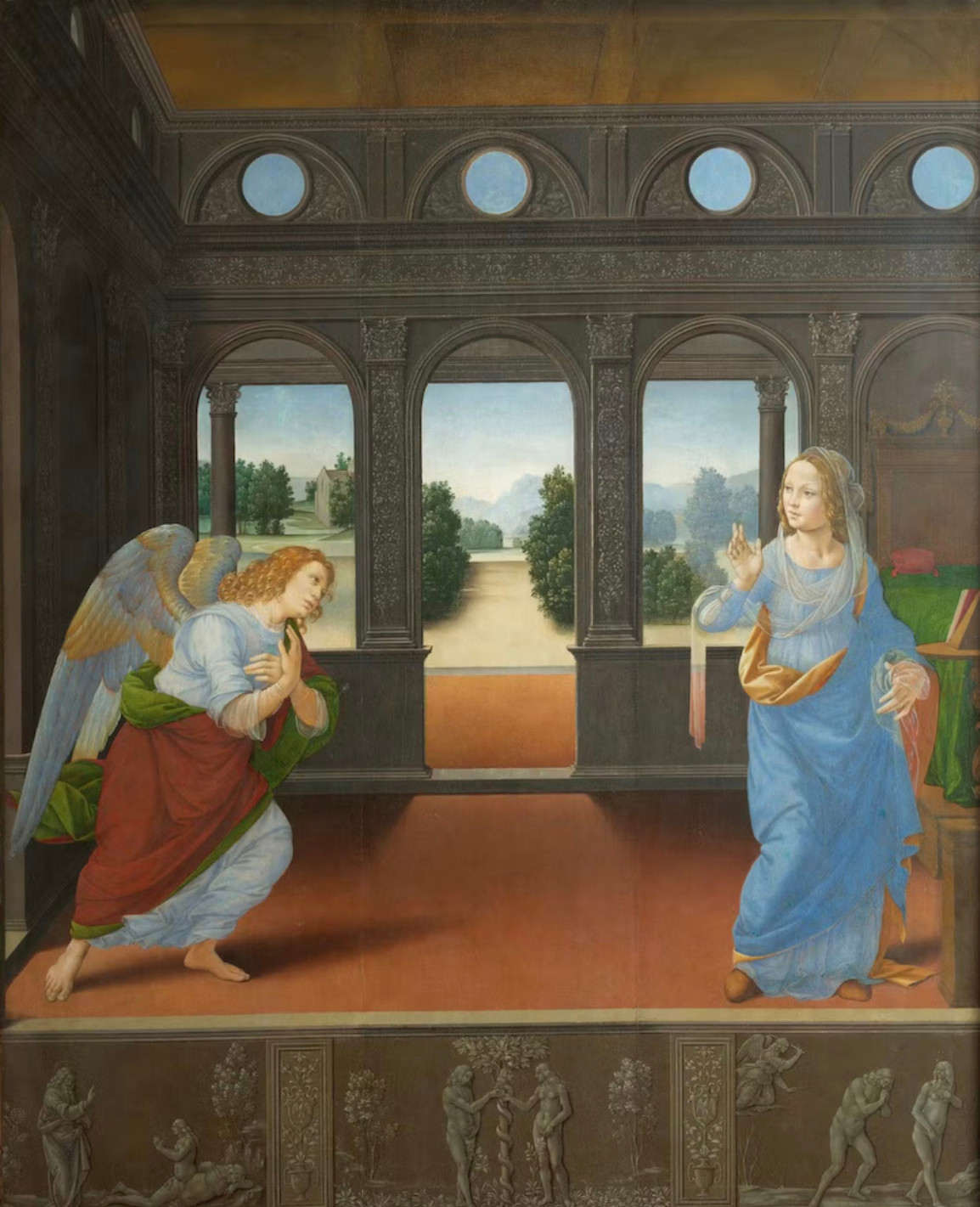 Set within an incredibly detailed domestic interior, Lorenzo di Credi’s beautiful “Annunciation” is in the Uffizi Galleries in Florence, Italy, and depicts the dramatic moment when the Archangel Gabriel “announces” to Mary that she is to be the mother of Christ. The two figures are set at the sides of the painting to showcase the beautiful landscape background through the monochrome architectural backdrop. The lower parapet of the painting instead depicts three Old Testament scenes of the “Creation of Eve,” “Original Sin,” and “The Expulsion from Eden.” Buona visione!