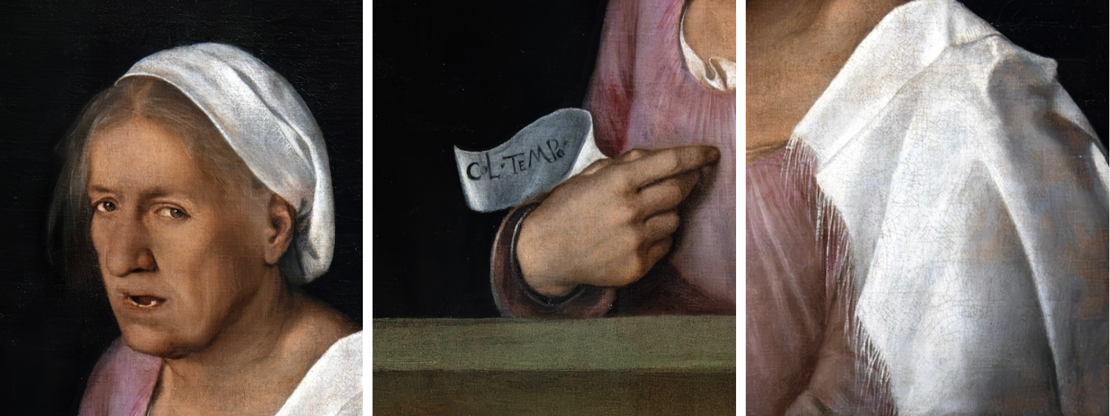 Painted by Giorgione around 1506, “La Vecchia” (“the Old Lady”) is in the Accademia Gallery in Venice, Italy. While at first glance the painting may appear to be a portrait, the low socioeconomic appearance of the subject would preclude the possibility of her portrait being painted by an artist of the esteem of Giorgione. The painting is more likely an allegorical work demonstrating the effects of time as the figure holds a scroll with the words “Col Tempo” (“with time”). Buona visione!