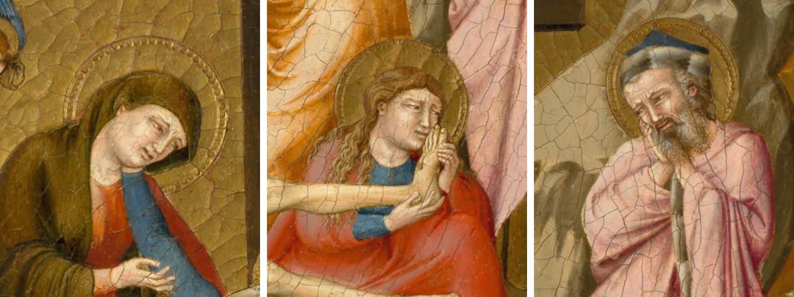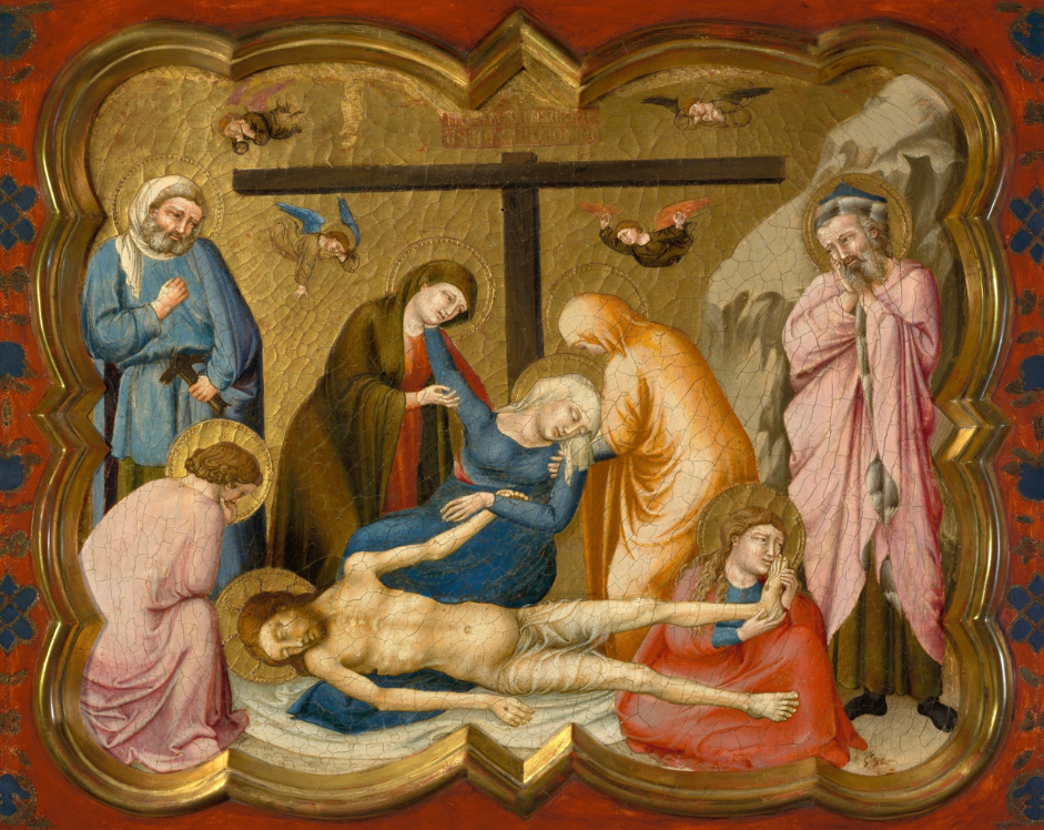 Painted in the 14th century by an unknown artist known as the “Master of the Fogg Pietà” and located in the Harvard Museums in Cambridge, MA, the “Lamentation” was most likely part of the predella of a larger altarpiece. The emotionally charged panel depicts a rather stiff figure of Christ whose body has just been removed from the cross and placed on the lap of his mother, who is clearly overwhelmed by grief and assisted by two women. Mary Magdalene caresses the foot of Christ while St. John the Apostle mourns over his head. Bookending the group are Nicodemus and Joseph of Arimathea. Buona visita!