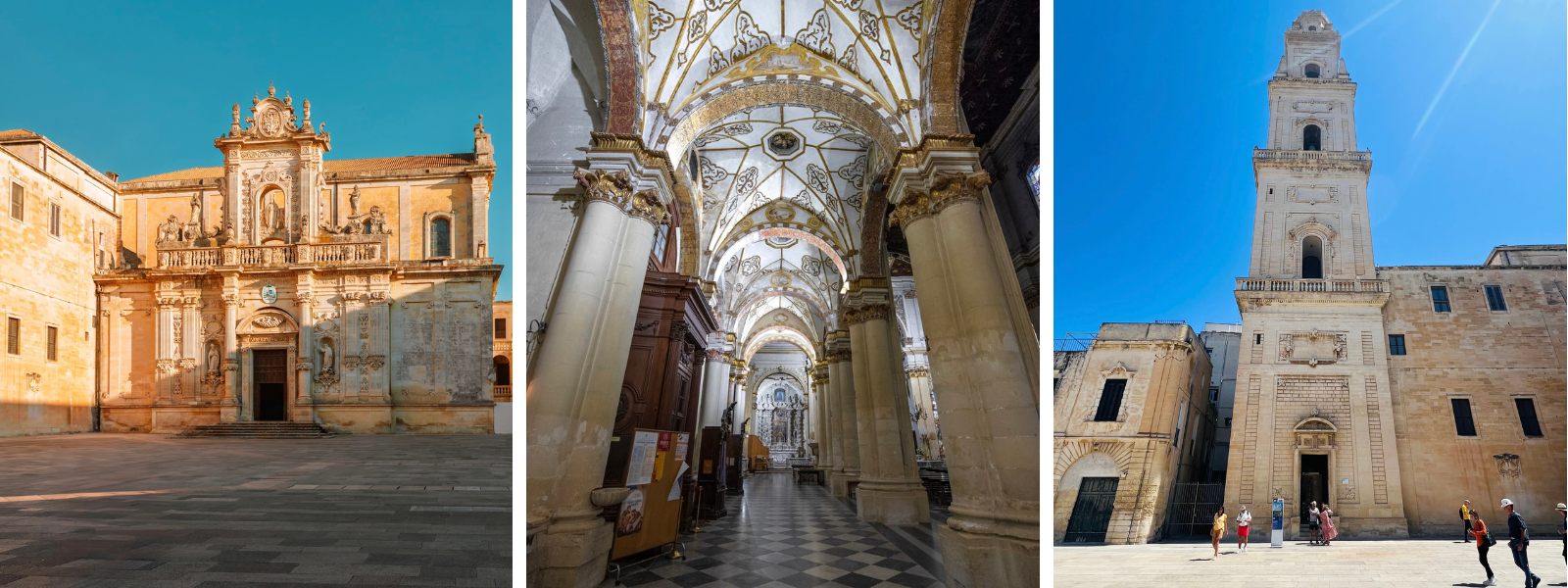 First built in 1144, the Cathedral of Lecce was entirely rebuilt in the 17th century. It is dedicated to St. Orontius, the patron saint of the city. The northern entrance is a masterpiece of Baroque architecture, while the western entrance is more classical and linear. The cathedral has a Latin cross plan with interior columns and pilasters made of the elegant local Lecce stone. Surrounding the church are a series of 12 side chapels, each containing its own altar decorated with beautiful paintings. Buona visita!