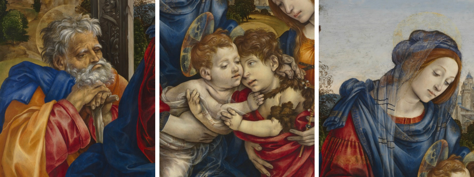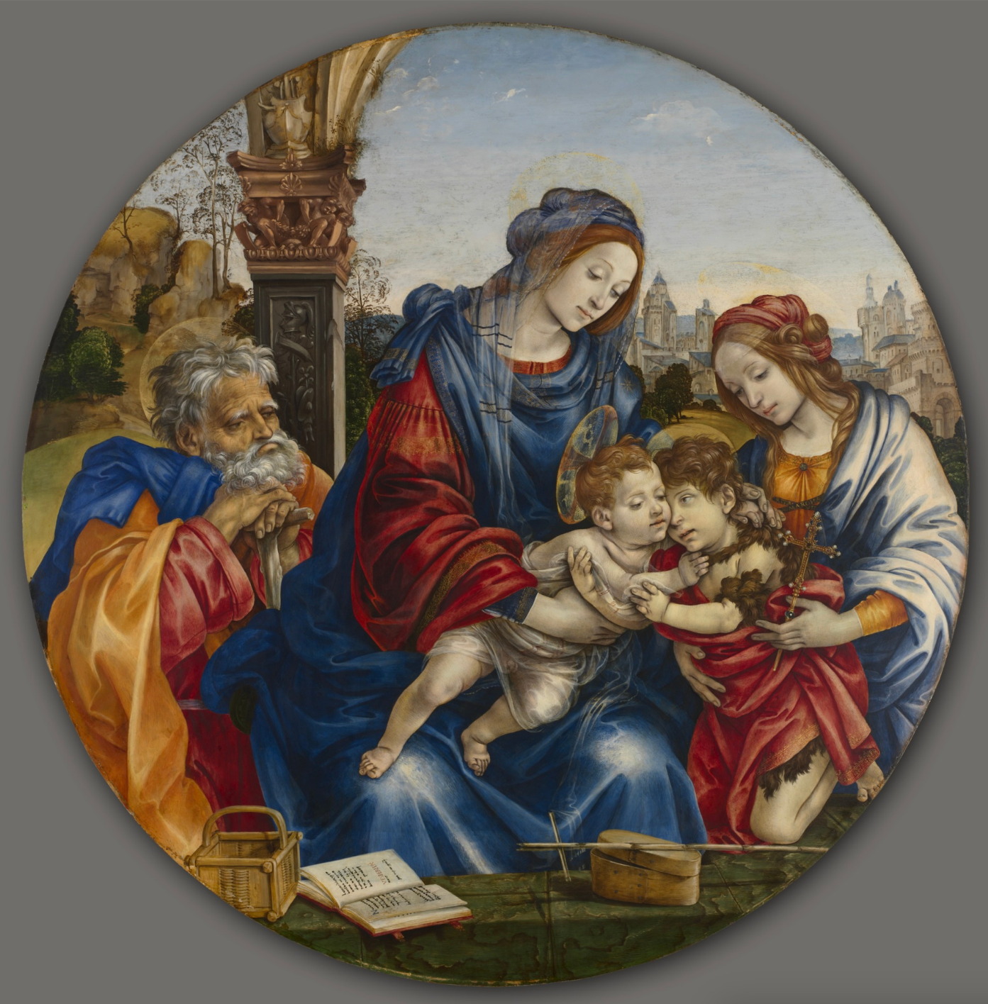 “The Holy Family with St. John the Baptist and St. Margaret” was painted by the Florentine painter Filippino Lippi for the powerful Cardinal Oliviero Carafa while Filippino was in Rome painting the Carafa Chapel for the same patron between 1488-1493. It was painted in the “tondo” (round) format, which most likely means it was intended for a domestic setting. Five brightly colored figures fill the foreground space with Mary and Margaret supporting young Jesus and John the Baptist, as Joseph looks on. Buona visione!