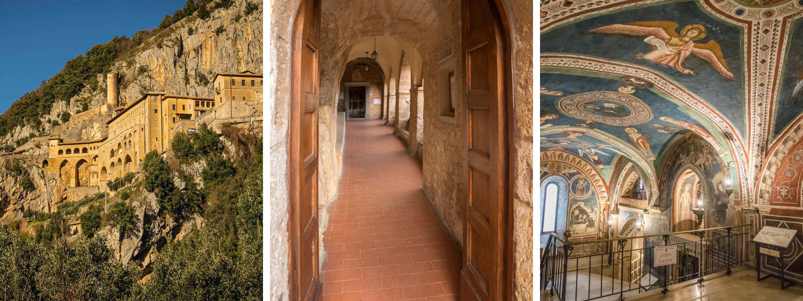 The Abbey of San Benedetto is located in the town of Subiaco in the north of the Italian region of Lazio. It was originally built in the 6th century directly onto the cliffs of Mt. Taleo, on the spot of the cave – “Sacro Speco” – where St. Benedict lived as a hermit for three years. Most of the current structure was built in the 11th century and it contains the earliest known portrait of St. Francis of Assisi, dated around 1223, when the saint was still alive. Buona visita!