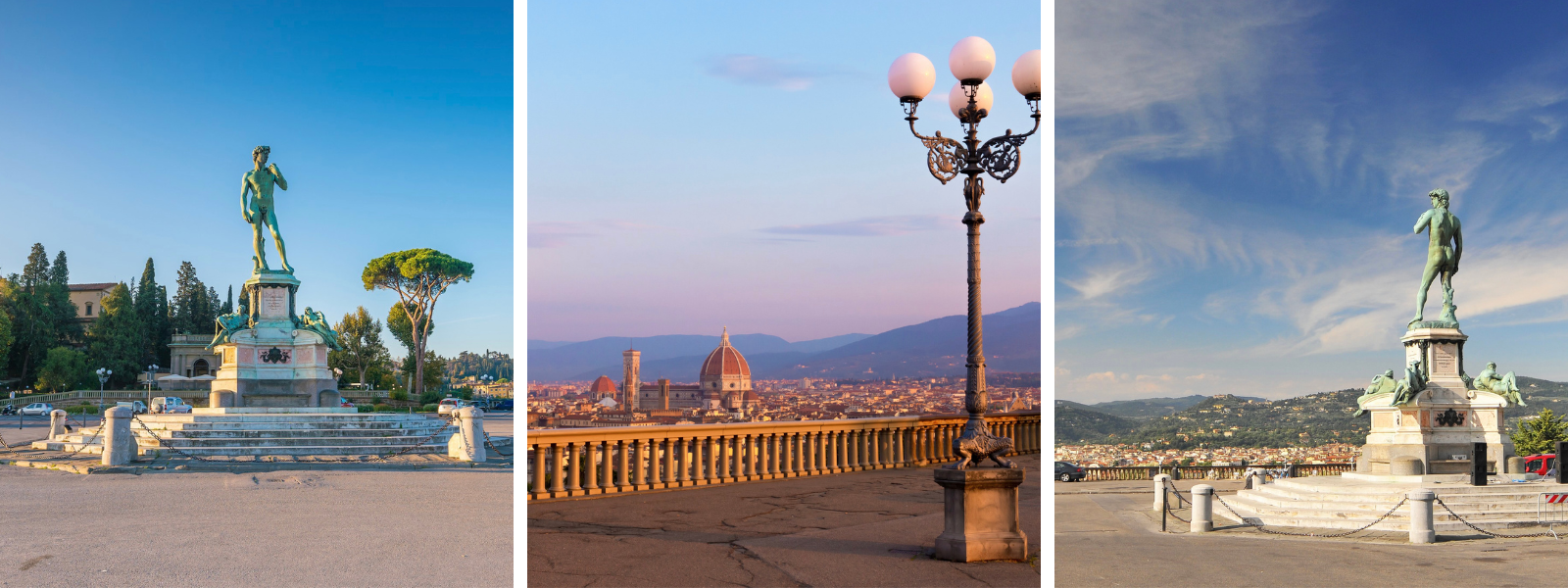 The Piazzale Michelangelo is a large piazza, or square, overlooking the city of Florence, Italy. It is located on the southeastern side of the city and offers breathtaking views of the Renaissance city. Designed in 1869 by the architect Giuseppe Poggi, the piazza is dedicated to Florence’s greatest artist – Michelangelo. In fact, there is a full-size bronze copy of Michelangelo’s “David” in the center of the piazza surrounded by bronze copies of Michelangelo’s four “Times of the Day” statues. Tourists and Florentines alike flock to the Piazzale Michelangelo in the evening to enjoy bedazzling sunsets. Buona visita!